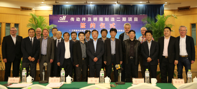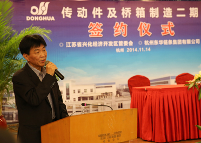 簽約儀式上,董事長宣碧華致辭。他說,東華2007年收購興化齒輪廠,至今已有8年,一直得到了興化市委、市政府和興化開發區的大力支持,使一個當時不太景氣的企業,得到了新生、發展。現在不僅是鏈條行業,齒輪、鏈輪、變速箱、橋箱將同步發展。今天簽約的興化這個項目,我們考慮了東華發展的增量和存量。增量是我們希望到2020年生產總量翻一番,興化的這個土地就是我們的增量空間。存量有兩塊,一是原來我們在外采購的原材料、零部件,拿回來放在興化生產,保證質量;二是現在臨平三廠區制造鏈條要退二進三,騰籠換鳥,把騰出來的廠房做新的項目,比如傳動件超市、輸送機械、CVT變速箱,所以今天我們在這兒舉行簽約儀式,對東華來講是一個很好的發展機會,具有里程碑意義。