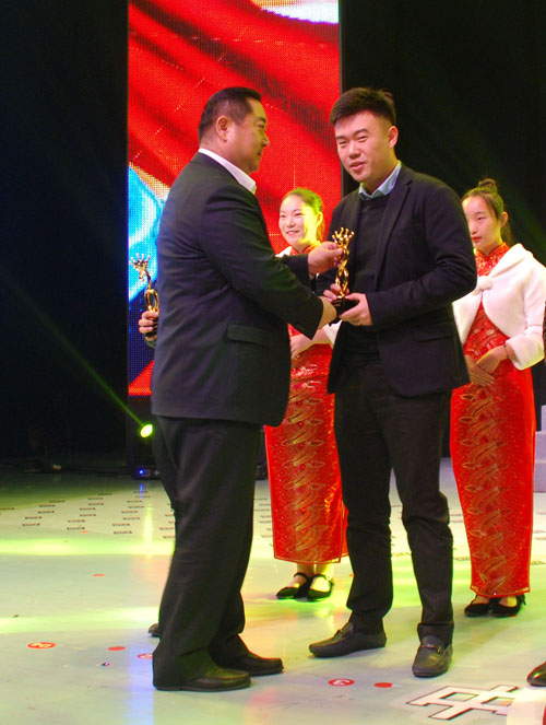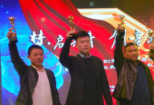 副董事長宣成(中)與其他十佳創業明星高興獎杯