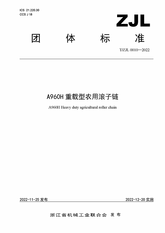 近日,浙江省機(jī)械工業(yè)聯(lián)合會(huì)批準(zhǔn)、發(fā)布團(tuán)體標(biāo)準(zhǔn)T/ZJL 0010—2022《A960H重載型農(nóng)用滾子鏈》(以下簡稱《A960H鏈條》),自12月20日起實(shí)施。這項(xiàng)浙機(jī)聯(lián)團(tuán)體標(biāo)準(zhǔn)由東華牽頭負(fù)責(zé)制定,東風(fēng)農(nóng)機(jī)集團(tuán)等4家單位參加起草。《A960H鏈條》標(biāo)準(zhǔn)規(guī)定了適用于在各類農(nóng)作物作業(yè)機(jī)械上使用的A960H重載型農(nóng)用滾子鏈的主要參數(shù)和尺寸、技術(shù)要求、試驗(yàn)方法、檢驗(yàn)規(guī)則等要求。