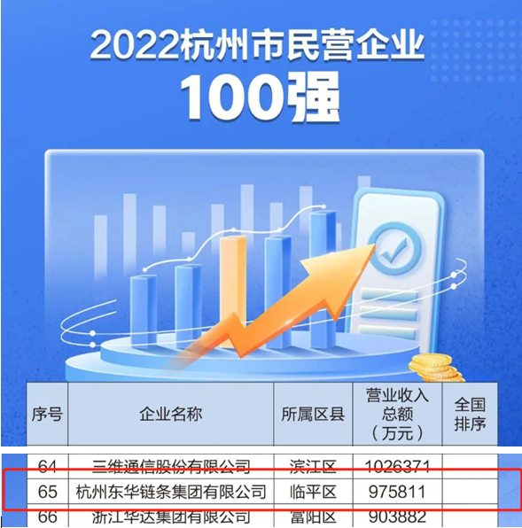 東華鏈條集團(tuán)分別榮登“2022杭州市民營(yíng)企業(yè)100強(qiáng)”第65位;“ 2022杭州市民營(yíng)企業(yè)制造業(yè)50強(qiáng)”第34位;“2022杭州市民營(yíng)企業(yè)就業(yè)50強(qiáng)”第43位;“2022杭州市民營(yíng)企業(yè)研發(fā)投入50強(qiáng)”第46位。其中,“2022杭州市民營(yíng)企業(yè)100強(qiáng)”入圍門檻為33.68億元,有41家企業(yè)入選“2022中國(guó)民營(yíng)企業(yè)500強(qiáng)”。