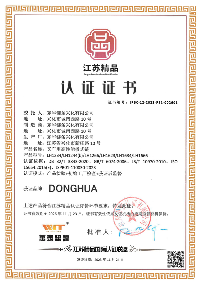 11月,東華板式鏈獲得“江蘇精品”認(rèn)證。(見(jiàn)下圖)