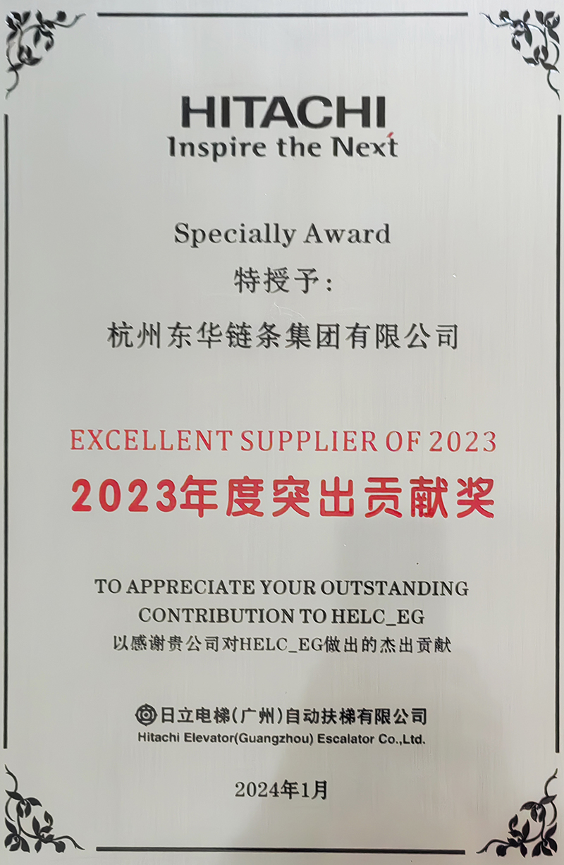 1月12日,在2023年度日立電梯(廣州)自動扶梯有限公司供應商大會上,東華鏈條集團獲日立電梯2023年度突出貢獻獎和戰(zhàn)略合作伙伴獎。扶梯工程鏈事業(yè)部總經理汪希上臺領獎。